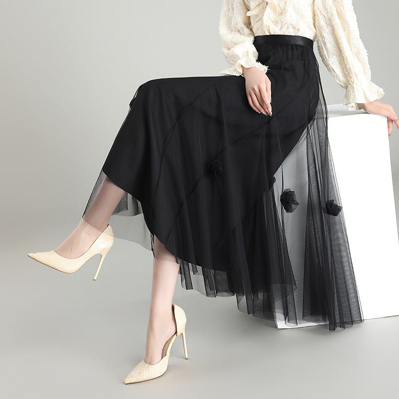 A high-waist A-line mesh skirt featuring a bowknot accent and light, breathable fabric. Perfect for creating an elegant Korean look.