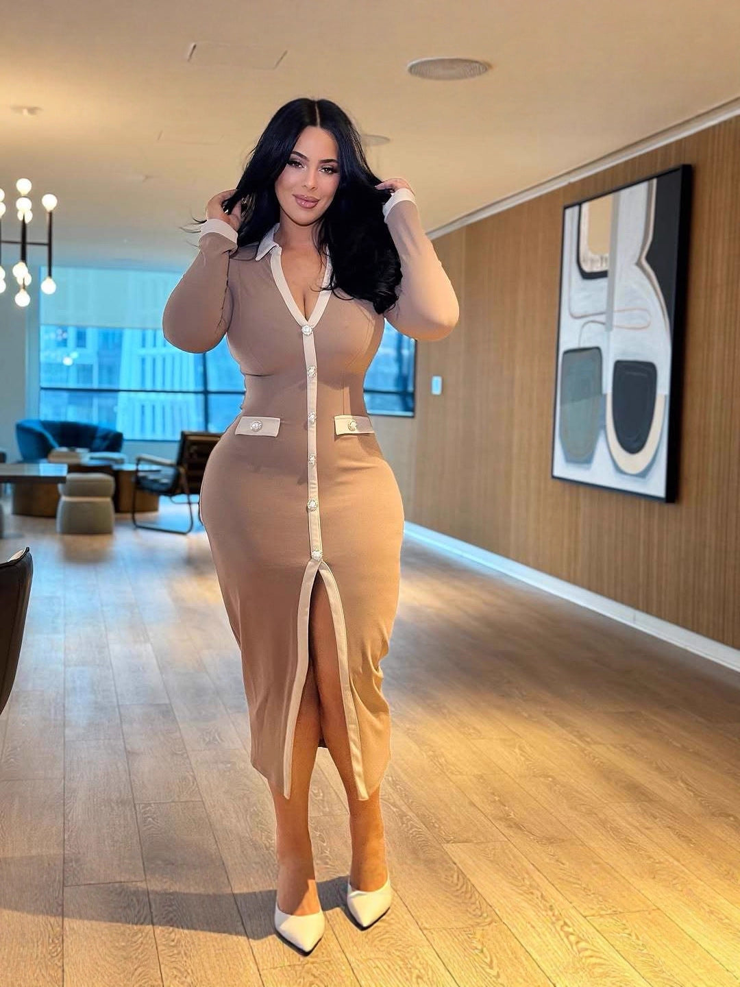 Classy Khaki V-Neck Button-Front Long Shirt Dress